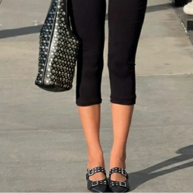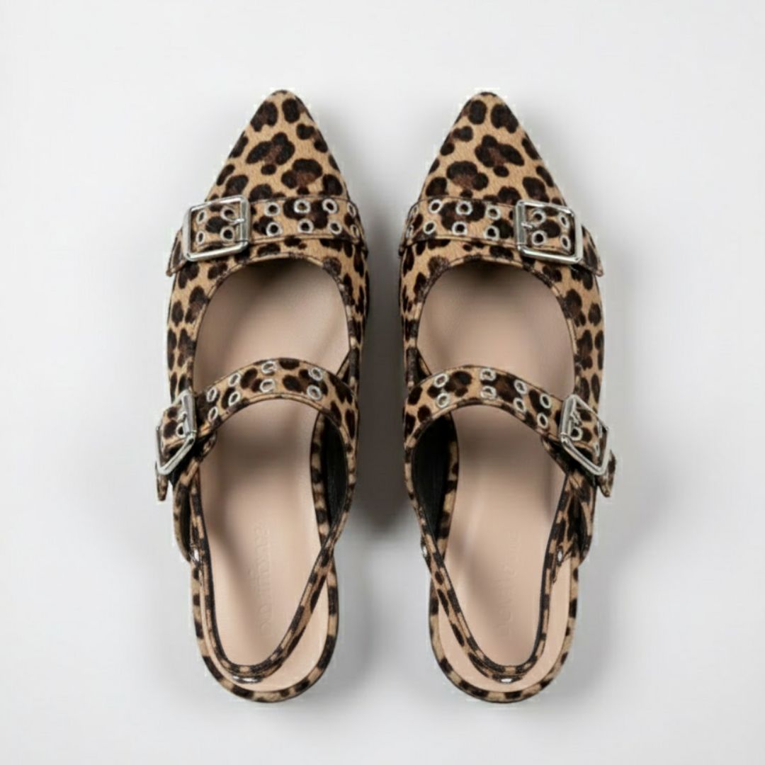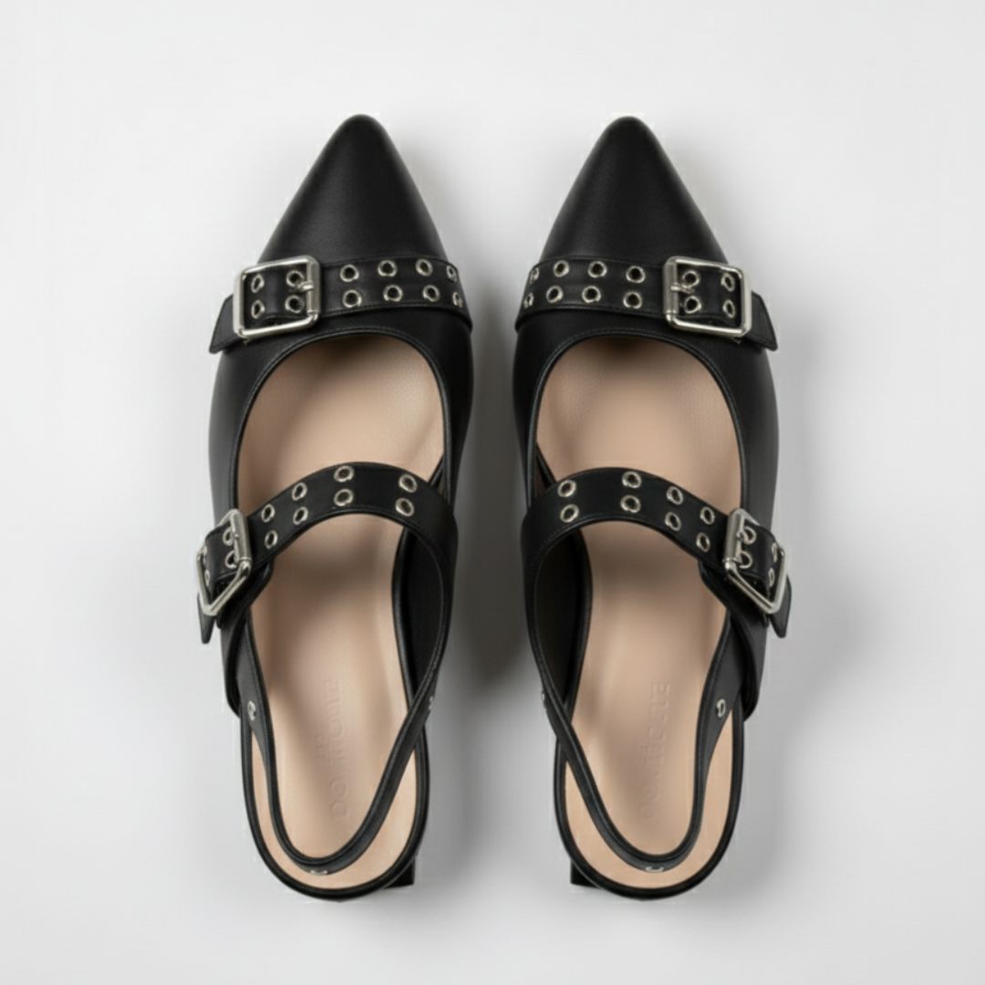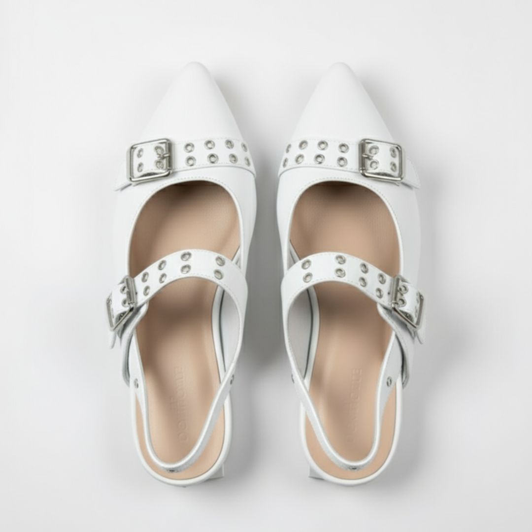Estas baletas puntudas fusionan la feminidad clásica con una vibra moderna y atrevida. Su diseño estructurado y los herrajes metálicos crean un equilibrio perfecto entre sutileza y carácter, elevando cualquier look sin esfuerzo.